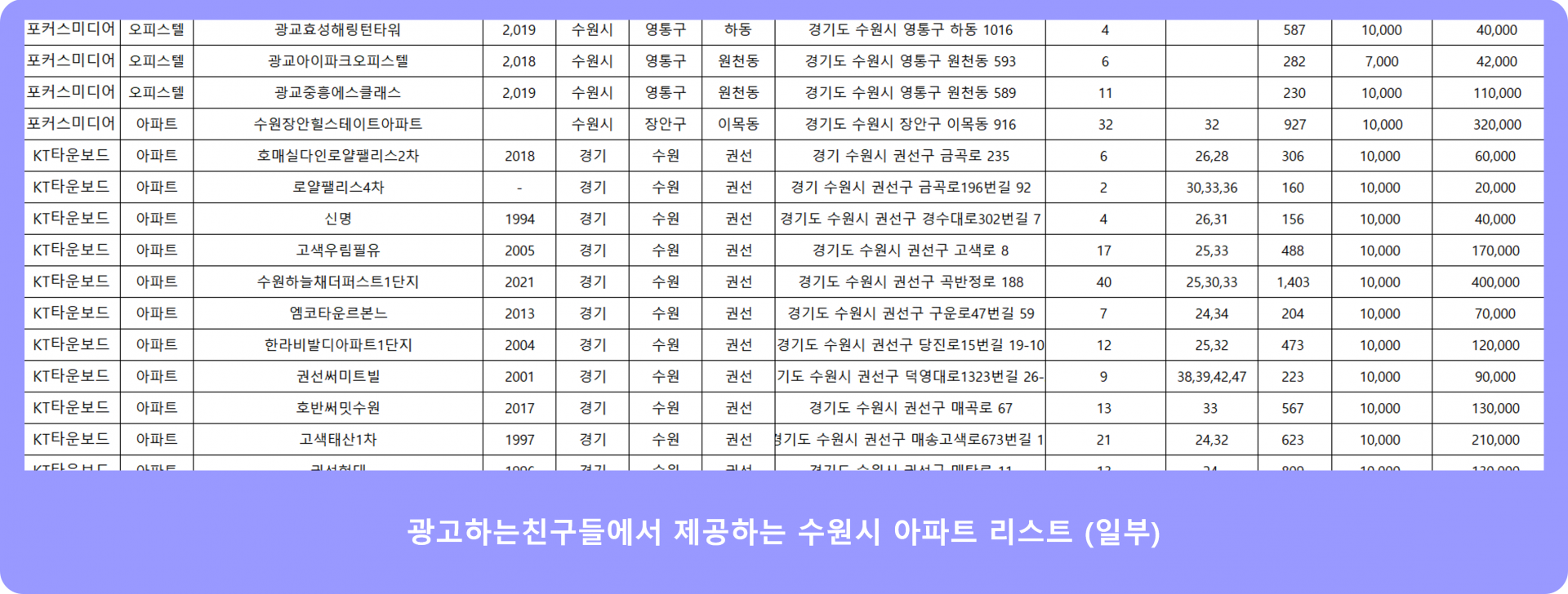 수원시 뿐만 아니라 전국 아파트 엘리베이터광고에 대한 리스트도 보내 드립니다