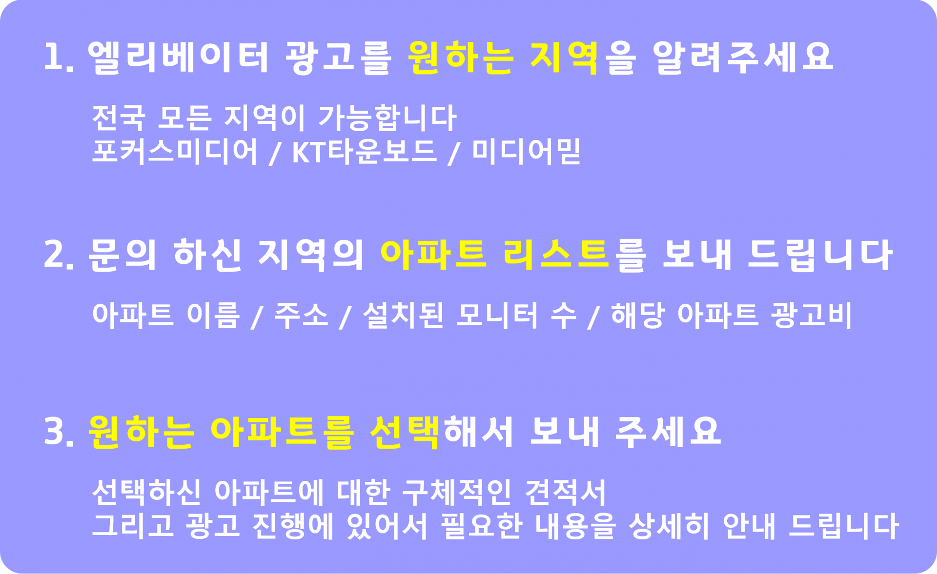 그렇다면 엘리베이터광고 진행 방법과 순서를 간단히 정리하면 아래와 같습니다